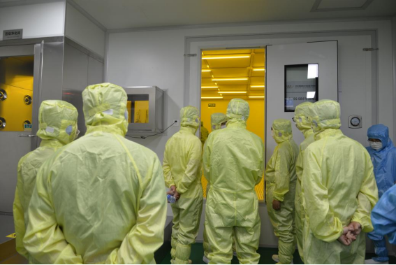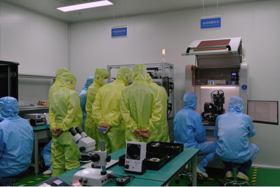 随后,领导嘉宾们在陈伟博士的带领下,实地参观了易缆微硅光异质集成薄膜铌酸锂中试线。作为国际上最早实现硅光薄膜铌酸锂异质集成的中试平台,这一中试线攻克了高精度键合与晶圆级加工等关键技术的瓶颈。易缆微的研发工程师们现场演示了薄膜铌酸锂晶圆级键合等关键环节,以及展示了芯片测试的眼图结果。与会的领导嘉宾们对易缆微工艺中试线的研发能力、工艺质量及环境布局等表示了极大的认可,对易缆微的发展前景充满期待。
